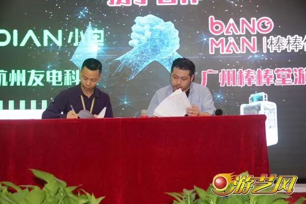 其后,发布会进行了签约仪式,杭州友电科技有限公司(以下简称友电科技)IOT项目负责人菰米先生与广州棒棒堂游乐设备有限公司总经理李程先生在台上进行签约。在台上,友电科技菰米先生表达了对本次合作的看法,他认为棒棒堂游乐的新产品抖蛋机前景非常良好,值得信任。
