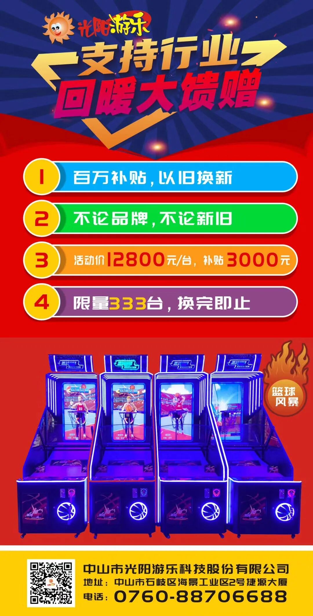 不论品牌,不论新旧,只要是篮球机,就可置换,篮球风暴活动价12800元/台,每台置换补贴3000元,限量333台,换完即止!现在已被预订100台,还有最后233个名额,再不抓紧时间,就要错过啦!