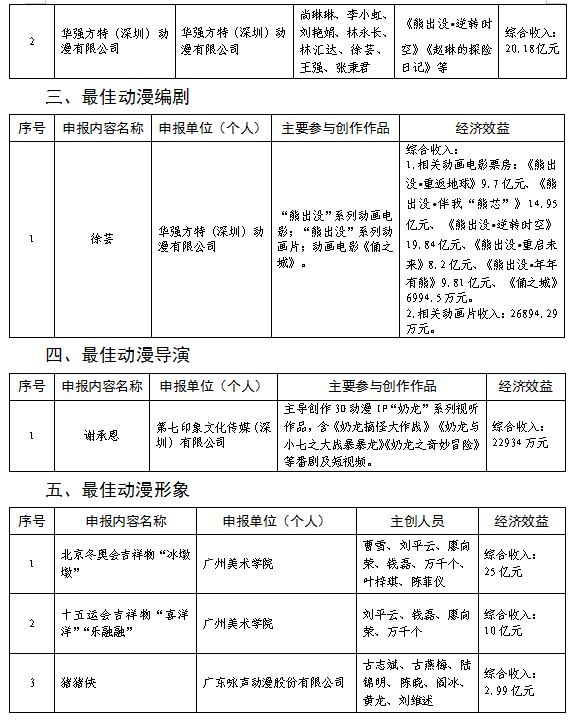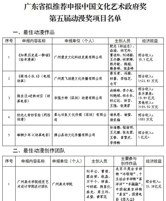 根据《中国文化艺术政府奖动漫奖评奖办法》和《文化和旅游部办公厅关于开展中国文化艺术政府奖第五届动漫奖评选工作的通知》,经主体申报、初步审核、专家评审等工作程序,形成了广东省拟推荐申报中国文化艺术政府奖第五届动漫奖项目名单(见附件),现予以公示。
