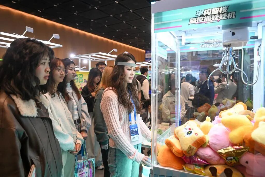 现场,一台脑控娃娃机前排起长龙。据工作人员介绍,体验者所戴的头环会采集大脑“注意力信号”并传递给机器,当佩戴者注意力越集中,娃娃机抓夹的抓力越大。