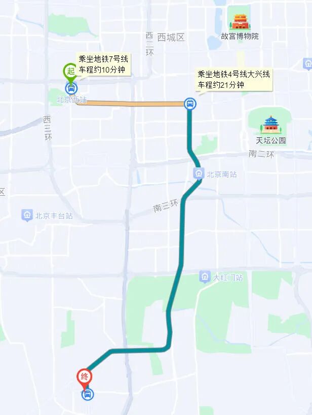 起点为北京西站:步行10米至地铁7号线(北京西站-环球度假区)北京西站上车,菜市口站下车,站内换乘地铁4号线大兴线(天宫院方向)菜市口站上车,至西红门站自地铁A通道出口步行80米即可到达泛时空北京荟聚店。