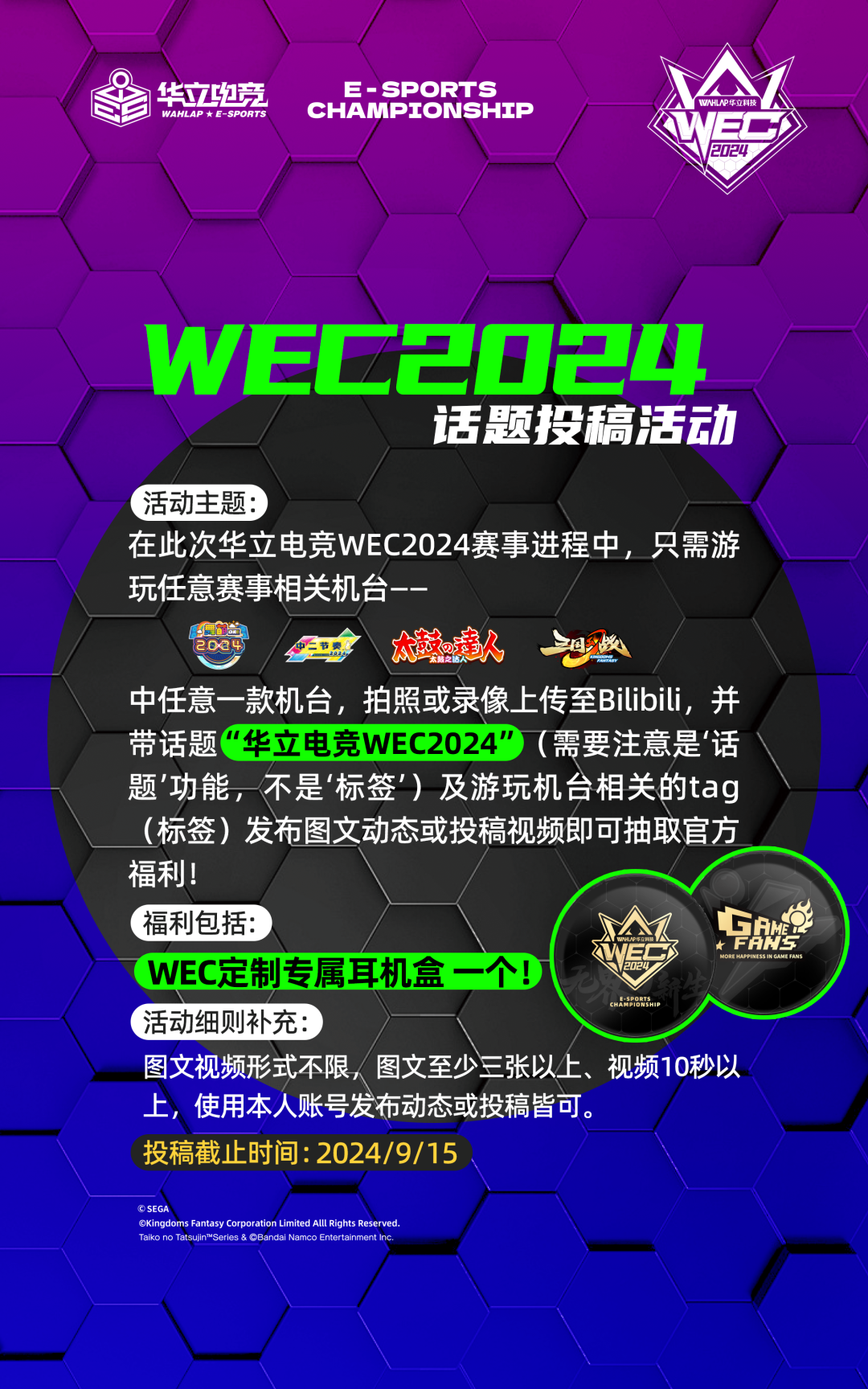 在WEC2024热烈举行之际,我们还为大家带来了一些额外小福利,非参赛选手线上参与活动,也有机会获得WEC2024专属限定周边哦!如图参与“华立电竞WEC2024”话题即有机会获得WEC定制专属耳机盒一个!