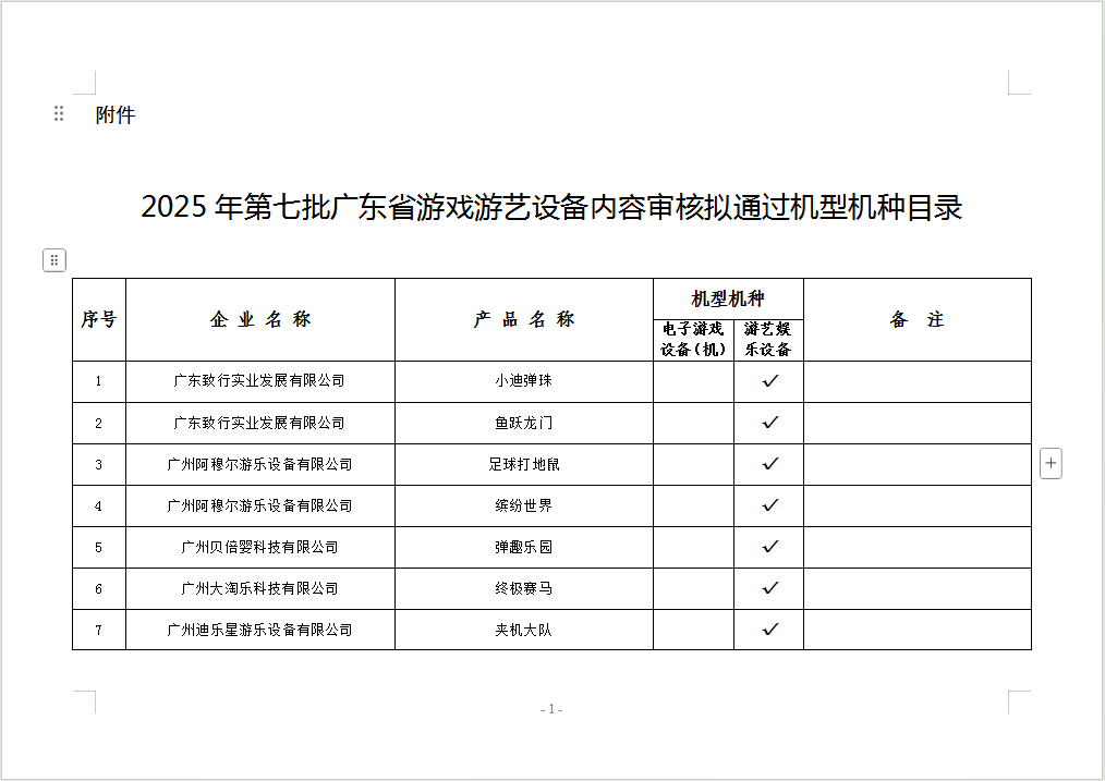 根据文化和旅游部《游戏游艺设备管理办法》等相关规定,现将我厅组织审核通过的《2025年第七批广东省游戏游艺设备内容审核拟通过机型机种目录》(详见附件)进行公示,公示期为2025年8月29日至9月4日,共7日。