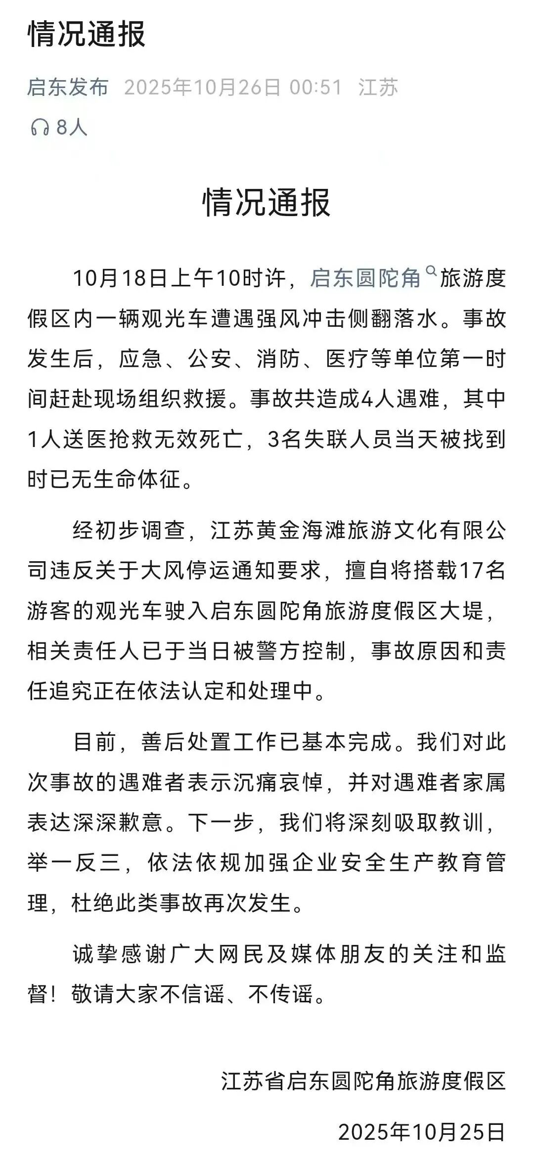 10月26日凌晨,江苏省启东市圆陀角旅游度假区发布通报称,10月18日上午10时许,景区内一辆观光车遭遇强风冲击侧翻落水。事故发生后,当地应急、公安、消防、医疗等单位第一时间赶赴现场组织救援。事故共造成4人遇难,其中1人送医抢救无效死亡,3名失联人员当天被找到时已无生命体征。